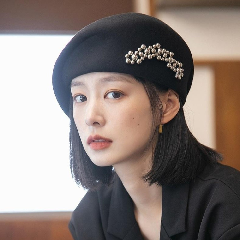 이날은 베레모 앞머리를 다 흘리고 이마 반 이상 가리고 있는데요. 이렇게 쓰면 쉐입이 더 단정하고 모자에 구김이 없어서 예뻐보여요!!