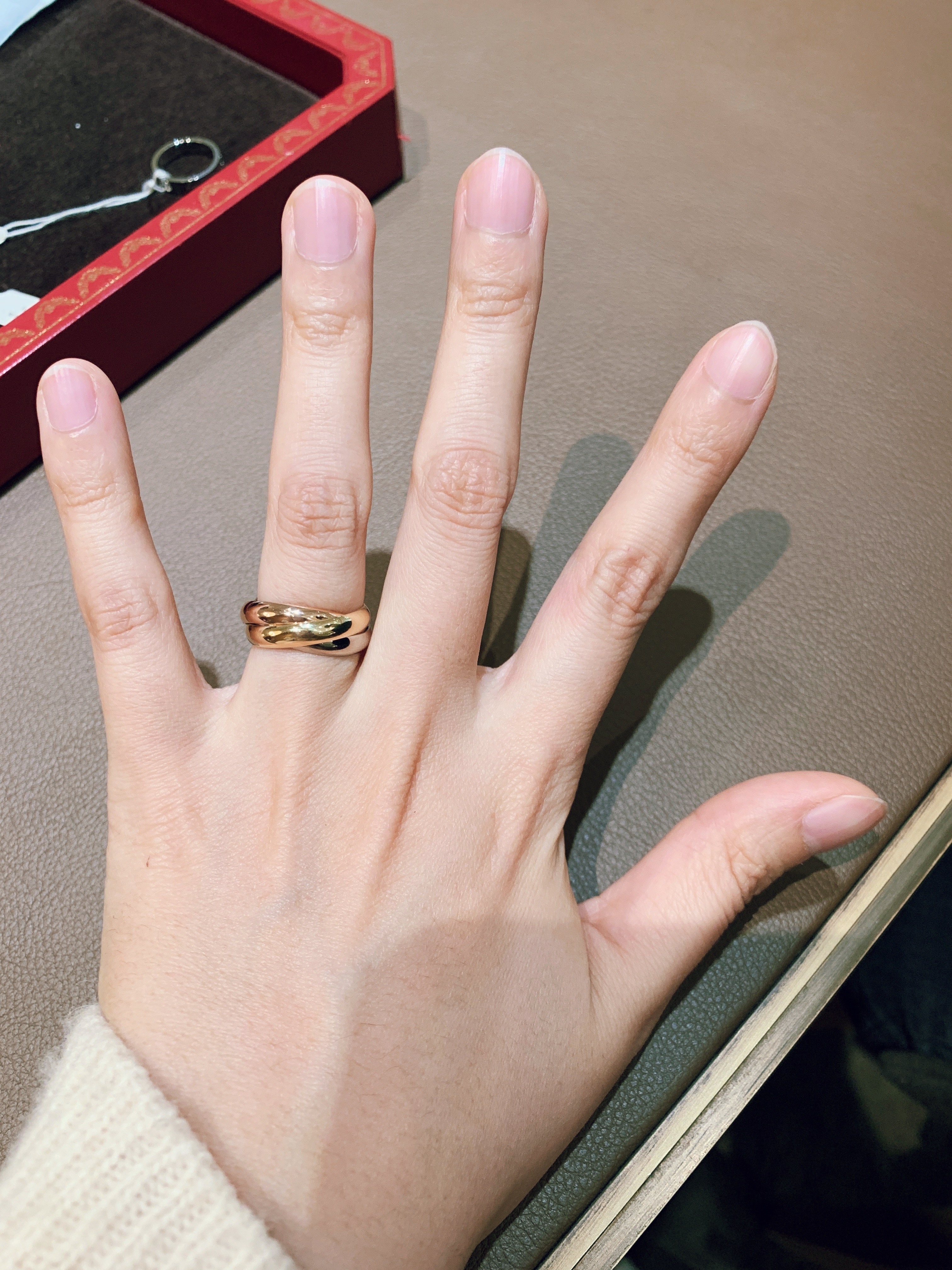 제가 이번에 산 반지는 #컬티에트리니티 링입니다!#트리니티 링은 오리지널 클래식 모델과 조금 얇게 나온 small 모델이 있습니다.#러브팔찌와 #저스트앵클팔찌는 둘다 오리지널로 구매했는데 -트리니티링은 SM사이즈가 저에게 더 잘 어울릴 것 같아서 이번 반지는 SM사이즈로 구매했습니다.클래식을 하면 손가락이 더 짧아보이는 느낌ㅋ